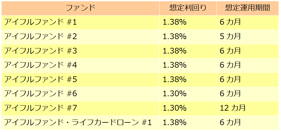 7号アイフルファンドとこれまでのファンドの違いは、想定利回りが0.08%下がったこと、想定運用期間が12カ月になったことです。