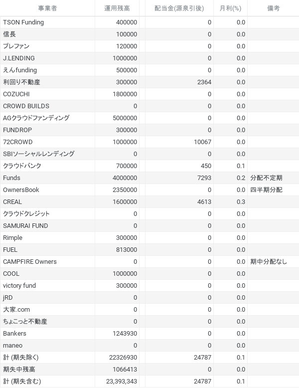 先月の運用実績を紹介します。分配金、事業者、利回り、運用期間と異なる切り口から、ファンド分析します。