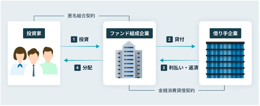 Fundsでは、われわれ個人投資家からお金を集め、ファンド組成企業を経由して、お金を企業に間接的に貸し付けます。